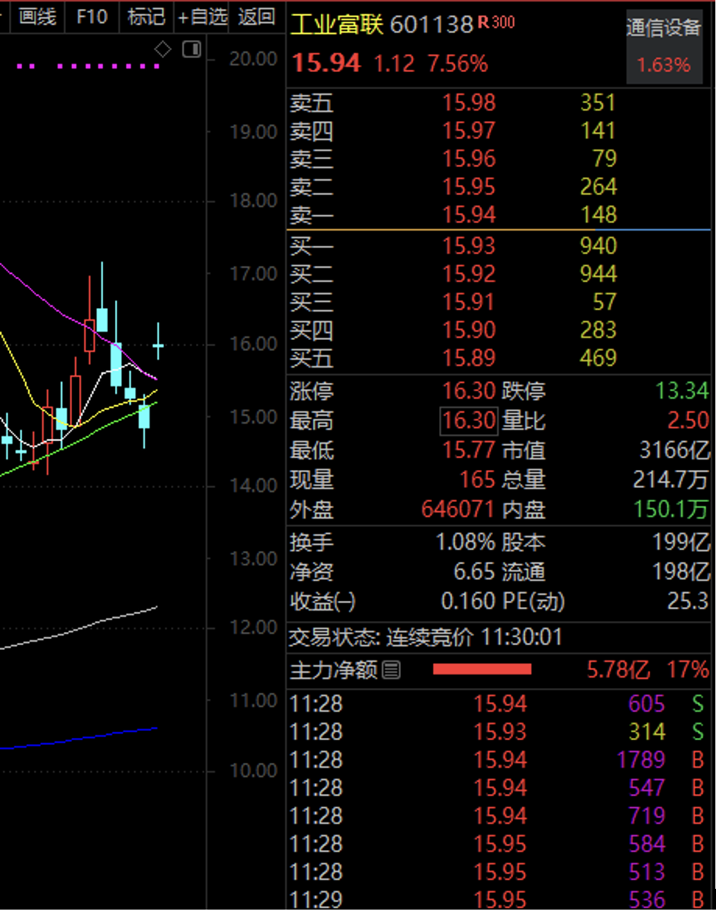 今天早盘表现最好的权重股当属工业富联,开盘1秒钟涨停。截至上午收盘,该股报13.93元,涨7.56%。消息面上,英伟达公布超预期财报,利好作为英伟达核心供应商的工业富联。