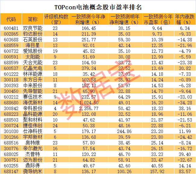 证券时报·数据宝统计,TOPcon电池概念股合计有50只。其中,3家以上机构评级个股中有26股机构一致预测今、明两年净利增速均超30%。