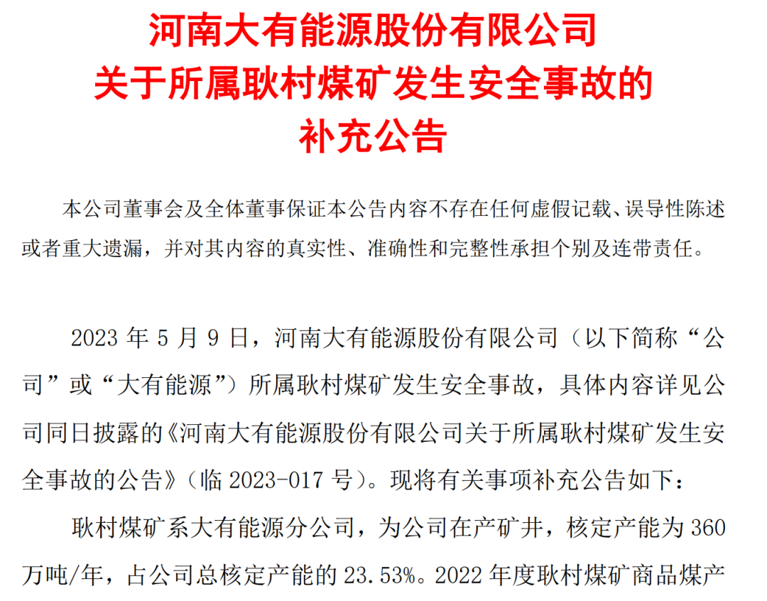据该公司此前公告,此次发生事故的耿村煤矿,是大有能源于2010年购入,该矿区位于河南省渑池县境内。