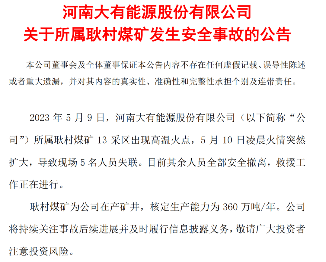 5月10日晚间大有能源(600403)公告,2023年5月9日,公司所属耿村煤矿13采区出现高温火点,5月10日凌晨火情突然扩大,导致现场5名人员失联。目前其余人员全部安全撤离,救援工作正在进行。