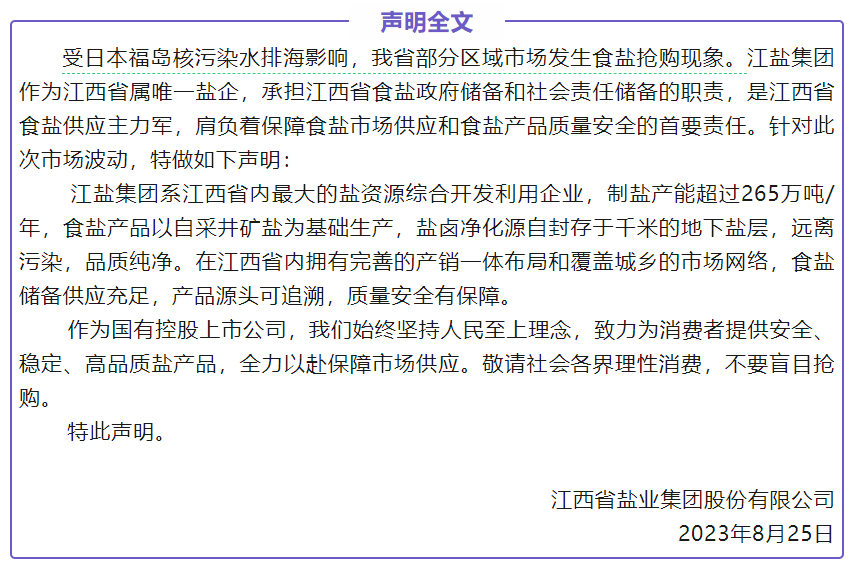 今日早间,江盐集团发布保障食盐市场安全稳定供应的声明,声明称,江盐集团系江西省内最大的盐资源综合开发利用企业,制盐产能超过265万吨/年,食盐产品以自采井矿盐为基础生产,盐卤净化源自封存于千米的地下盐层,远离污染,品质纯净。在江西省内拥有完善的产销一体布局和覆盖城乡的市场网络,食盐储备供应充足,产品源头可追溯,质量安全有保障。