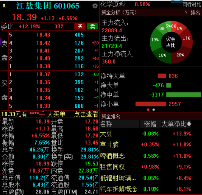 8月25日,江盐集团大幅高开,截至发稿,该股涨超6%,报18.39元,换手率29.81%。此前连续三日涨停。