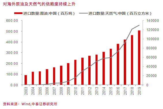 此外,原材料类(包含粮食、能源、矿石资源等)占据我国进口项下的另一个“半壁江山”,在外部风险加剧下,与其相关的粮食安全、能源安全、资源安全亦成为内循环供给端下需要进行的另一项改革。如2019年,原油进口达5.1亿吨,增长9.5%,对外依存度升至72.45%;天然气进口9656万吨,增长6.9%,对外依存度为44%。