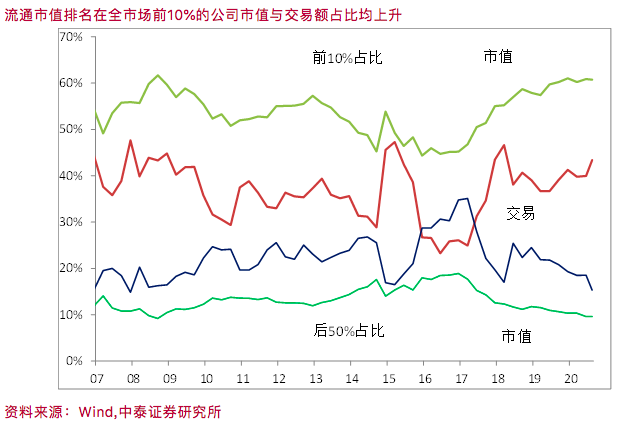 2017年初以来,两市交易集中于大市值股票(流通市值排名在全市场前10%),小股票(后50%)的交易日渐冷落:前10%的公司(每季末动态调整)的市值占比,自2017年以来趋势性抬升,目前超过60%。前10%公司股票的交易额占比也呈现类似态势,从2017年初的25%,抬升至目前的接近45%。与此相对应的是,后50%的公司,市值占比从2017年初的接近20%回落到目前的不到10%,交易额占比则从35%回落约15%。(注:大市值股票的换手率总是低于小市值股票)