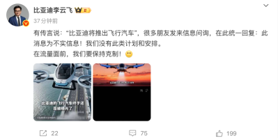 李云飞发文,对近期网传比亚迪将推出飞行汽车的消息进行辟谣。详情>>