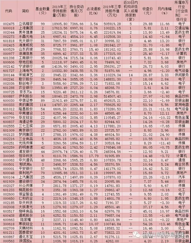 从增持角度看,截至今年三季度末,基金增持股份数量超1000万股的个股有52只,立讯精密、上港集团、美年健康等3只个股基金增持数量也均在5000万股以上,分别达到7366.66万股、6997.91万股和5075.34万股;水晶光电(4554.10万股)、光大银行(3985.01万股)、海康威视(3961.87万股)、山东药玻(3760.71万股)、浪潮信息(3737.33万股)、工商银行(3715.34万股)、绿地控股(3490.45万股)、宁波银行(3490.03万股)、上海电气(3438.55万股)、宋城演艺(3342.66万股)和歌尔股份(3055.05万股)等11只个股基金增持数量也均达到3000万股以上;联创电子、农业银行、京东方A、伊利股份、中信证券、美的集团、隆基股份、中南建设、华友钴业、海通证券、三七互娱等11只个股基金增持数量也均逾2000万股。另外,包括南京银行、梦网集团、三全食品、光线传媒、药明康德等在内的27只个股基金增持数量也均超过1000万股。