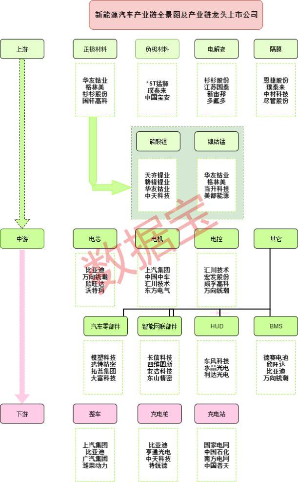 国内新能源汽车上、中、下游产业链已相当完整。上游材料有包括:正极材料(碳酸锂、镍钴锰)、负极材料、电解液、隔膜;中游材料包括电机、电芯、电控等;下游包括整车、充电桩及充电站等。