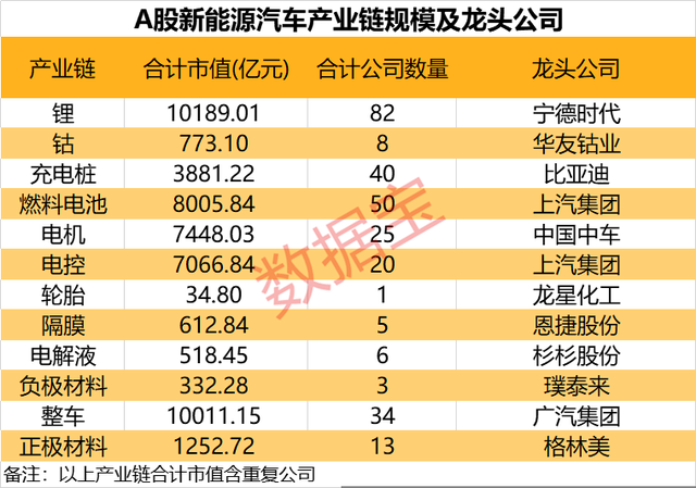 证券时报·统计显示,A股市场涉及新能源产业链公司共有262家,市值合计3.78万亿,6股市值上千亿,包括上汽集团、中国中车、宁德时代、比亚迪及广汽集团等。上汽集团市值居首为2890亿,涉及燃料电池、电机、电控、整车等产业链;中国中车市值1991.7亿元,涉及电机、电控产业链;宁德时代、比亚迪均涉及锂电池产业链。