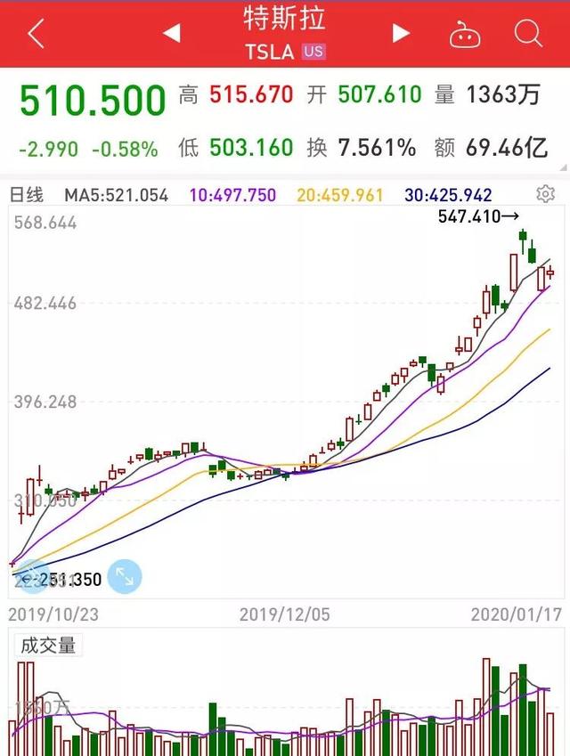 特斯拉仅用了一年时间把上海临港新区的一片农田变成了特斯拉首个海外超级工厂。2020 年1月7日,特斯拉首批国产Model 3实现大批量交付,价格降至30万元以下,同时正式宣布启动Model Y 项目。特斯拉新能源汽车的量产,同时将其公司股价也提升到了新台阶。从盘面来看,特斯拉最新收盘价510.5美元,1月14日报收537.92美元,创历史新高。