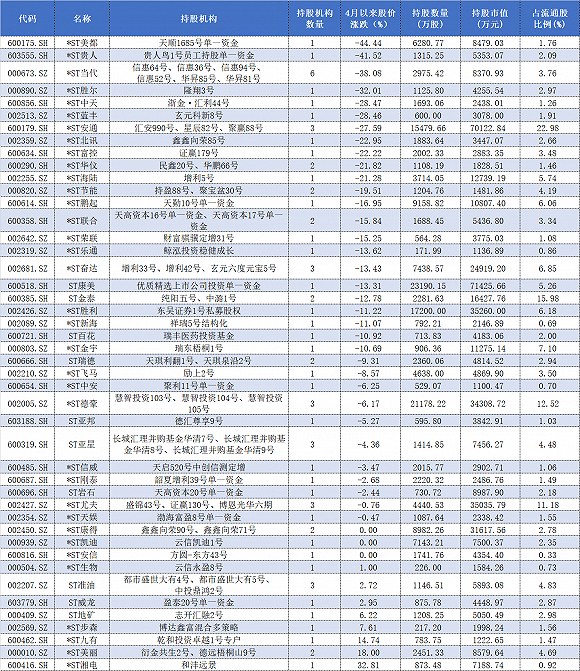在今年一季报时新进ST股前十大流通股东之列的还有“和沣远景”、“瑞丰医药投资基金”以及“浙金·汇利44号”,各自持有的个股分别是*ST湘电、*ST百花、*ST中天等。