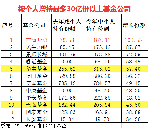 除前海开源基金外,全市场还有多家基金公司旗下产品受到散户认可,上半年个人份额增长了50万份以上。