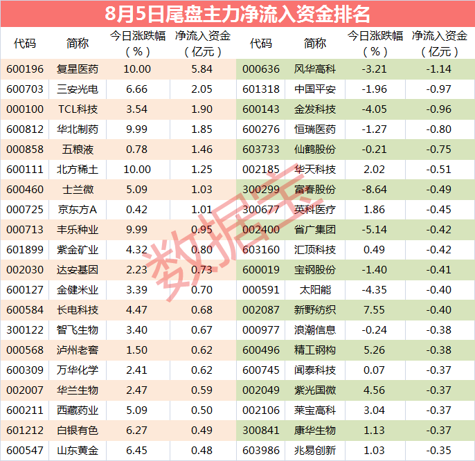 沪指8月5日上涨0.17%,主力资金全天净流出191.05亿元。其中,中小板主力资金净流出68.34亿元,创业板主力资金净流出26.94亿元,沪深300成份股主力资金净流出55.81亿元。