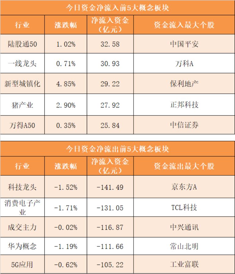 概念板块方面,今日陆股通50、一线龙头、新型城镇化、猪产业等概念板块资金呈现净流入,其中陆股通50概念净流入32.58亿元居首。
