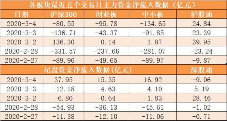 沪深300今日主力资金净流出80.55亿元,创业板净流出95.78亿元,中小板净流出134.65亿元。沪股通净流入24.84亿元,深股通净流出9.06亿元(本文中沪股通、深股通净流入额以当日已用额度来计,与成交净买入额略有差异,但表示的意义大体一致)。