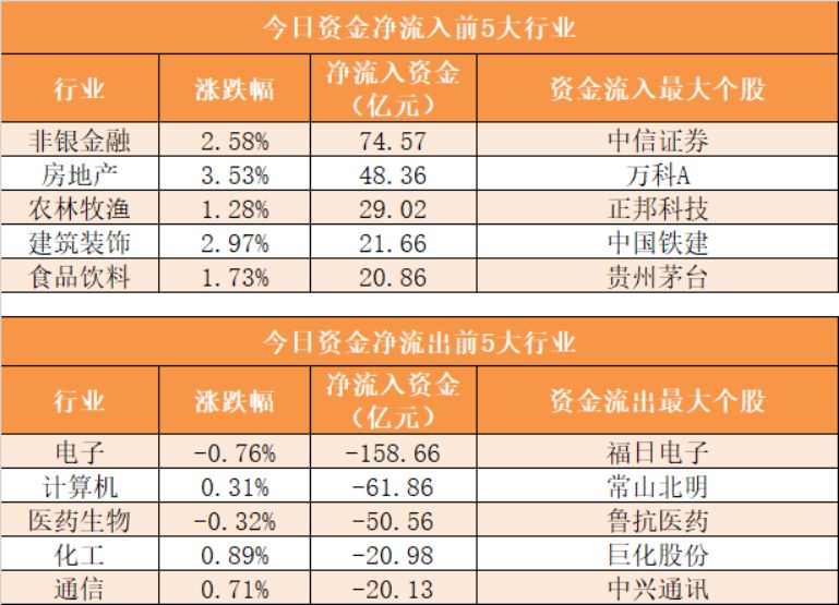 28个申万一级行业中,11个行业实现资金净流入,其中非银金融行业净流入74.57亿元居首。