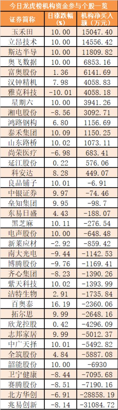 盘后龙虎榜数据显示,机构现身38股,其中玉禾田等15股呈现机构资金净买入,兆易创新等23股呈现机构资金净卖出。