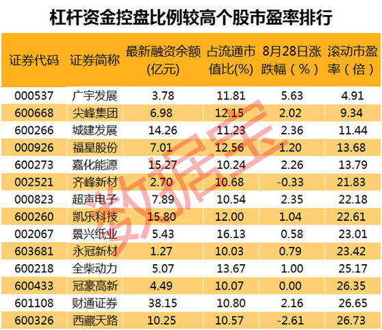 估值方面,融资余额占比超10%的个股中,滚动市盈率最低的是广宇发展,不足5倍,尖峰集团、城建发展、福星股份、嘉化能源市盈率均不足15倍,齐峰新材、超声电子、凯乐科技等个股市盈率不足25倍。