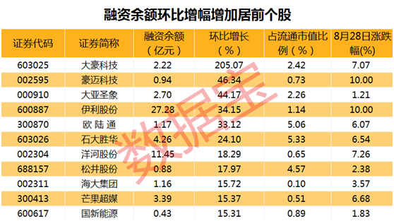 统计显示,11股融资余额环比增加超过15%,其中包括千亿白马股伊利股份、洋河股份和热门个股芒果超媒。大豪科技最新融资余额2.22亿元,环比增长205.07%排为榜首。其次是豪迈科技、大亚圣象,环比增长超过40%。融资余额环比增幅较大个股当日表现普遍良好,平均上涨5.69%。
