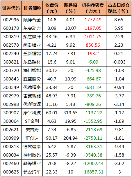 盘后龙虎榜数据显示,机构席位资金净卖出约4.15亿元,其中,净买入的个股5只,净卖出的个股14只。机构净买入最多的股票是顺博合金,净买入金额约为1772.49万元;机构净卖出最多的股票是长安汽车,净卖出金额约为1.69亿元。