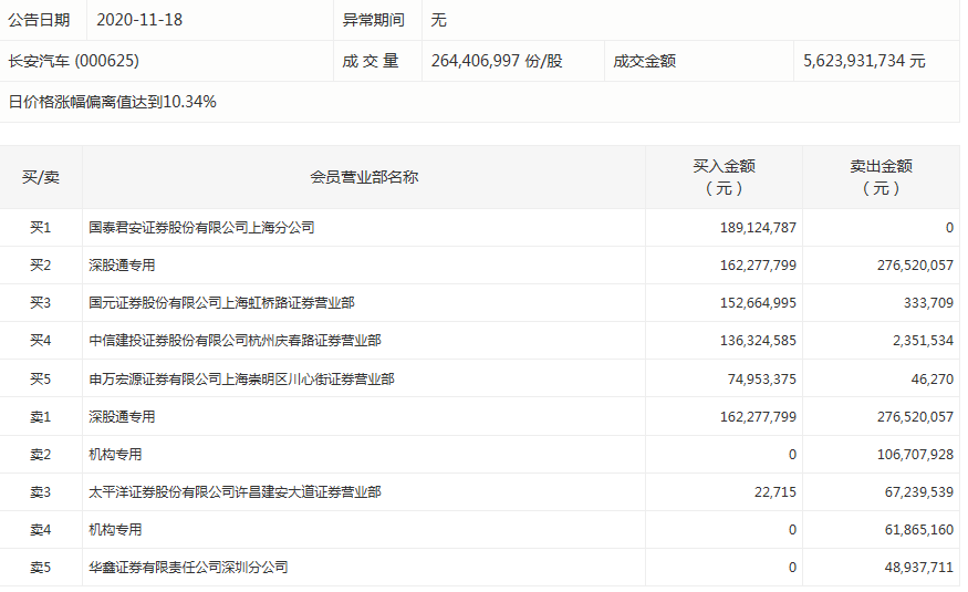 长安汽车今天涨停。盘后数据显示,2个机构出现在龙虎榜单上,分别位列卖2及卖4席位,合计净卖出1.69亿元;国泰君安证券股份有限公司上海分公司买入1.89亿元;中信建投证券股份有限公司杭州庆春路证券营业部买入1.36亿元,同时卖出235.15万元。