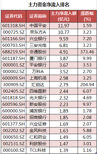 具体到个股来看,36股主力资金净流入超亿元。其中,中国平安、京东方A、兴业银行、三安光电、会通股份主力资金净流入居前,净流入金额分别为11.97亿元、10.77亿元、9.59亿元、6.81亿元、4.91亿元。