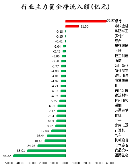 从行业板块来看,申万所属的28个一级行业,仅有银行、非银金融2个行业板块主力资金呈现净流入,净流入金额为35.97亿元、11.5亿元;26个行业板块主力资金呈现净流出,其中,医药生物、食品饮料、电气设备、机械设备、汽车行业板块主力资金净流出较多,净流出金额分别为46.32亿元、33.91亿元、24.76亿元、18.45亿元、16.44亿元。
