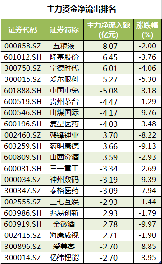 此外,72股被主力资金净卖出超亿元。其中,五粮液、隆基股份、宁德时代、爱尔眼科、中国中免主力资金净流出较多,净流出金额分别为8.07亿元、6.45亿元、6.01亿元、5.27亿元、5.08亿元。