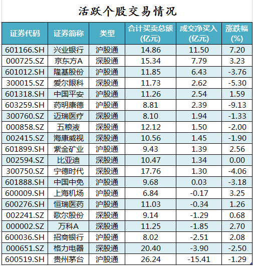 活跃个股方面,兴业银行、京东方A、隆基股份、爱尔眼科、中国平安北向资金净买入较多,净买入金额分别为11.5亿元、7.79亿元、6.43亿元、2.62亿元、2.54亿元;贵州茅台、格力电器、招商银行、万科A、歌尔股份北向资金净卖出较多,净卖出金额分别为15.41亿元、3.9亿元、2.51亿元、1.85亿元、1.29亿元。