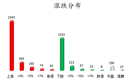 截至收盘,沪深两市合计2343只个股上涨,1533只个股下跌,平盘个股190只,停牌的个股15只。包括ST股在内,共有45只个股涨停,8只个股跌停。