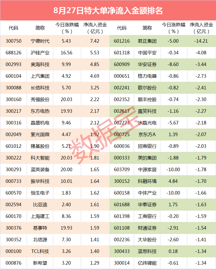 紧随其后是沪硅产业和奥海科技,特大单资金净流入分别为5.53亿元和4.85亿元。
