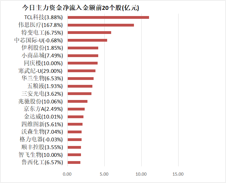 5、TCL科技主力资金净流入11.01亿元居首