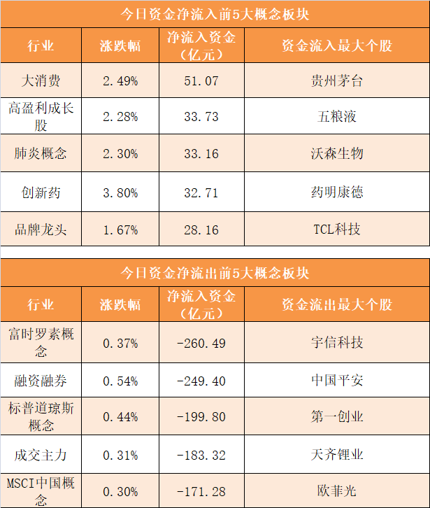 概念板块方面,今日大消费、高盈利成长股、肺炎概念、创新药等概念板块资金呈现净流入,其中大消费概念净流入51.07亿元居首。