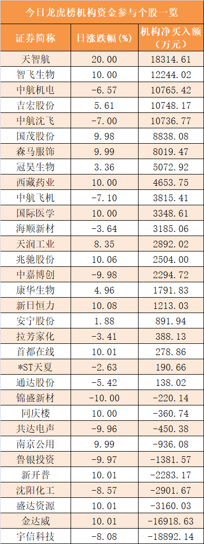 盘后龙虎榜数据显示,机构现身32股,其中天智航等22股呈现机构资金净买入,宇信科技等10股呈现机构资金净卖出。