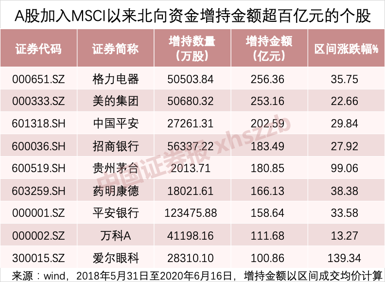 从2018年5月31日A股首次纳入MSCI以来,截至2020年6月17日,北向资金净流入A股超6000亿元,格力电器、美的集团、中国平安等9只个股被买入超百亿元,9只个股在这期间的平均涨幅达到48.87%。