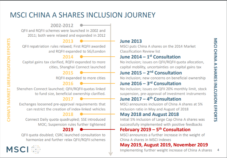 2019年,MSCI决定将A股纳入因子提升至20%,并于2019年5月、8月和11月分三步实施,纳入符合条件的创业板股票和中盘A股。2019年11月纳入实施完成后,472只A股成为MSCI标的,A股占MSCICHINA指数权重达到12.1%,占MSCI新兴市场指数权重达到4.1%。