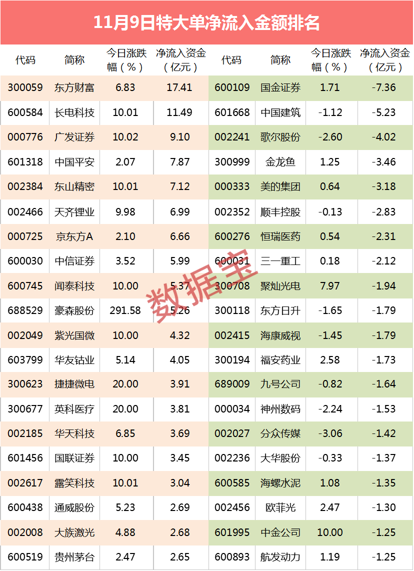 两市有75股大单资金流入超亿元。东方财富大单资金流入居首,股价涨近7%。今日券商股涨幅居前,中金公司、广发证券、国联证券等涨停,中金公司上市首日开板后,股价已连涨5天,区间涨幅超50%。今日市场成交再度突破万亿大关,且深成指突破今年7月份的阶段高点,显示出资金对A股后市的看好,作为“牛市旗手”的券商股受资金追捧。广发证券龙虎榜显示,深股通席位净买入2.49亿元。大单资金方面,广发证券流入超9亿元,中信证券流入近6亿元,国联证券、华泰证券等流入额均超2亿元。