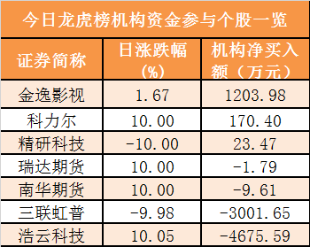 盘后龙虎榜数据显示,机构现身7股,其中金逸影视等3股呈现机构资金净买入,浩云科技等4股呈现机构资金净卖出。