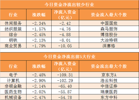 28个申万一级行业中,无一行业实现资金净流入,电子、计算机、非银金融、医药生物等行业净流出规模居前,其中电子行业净流出109.31亿元居首。
