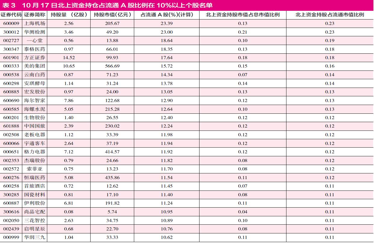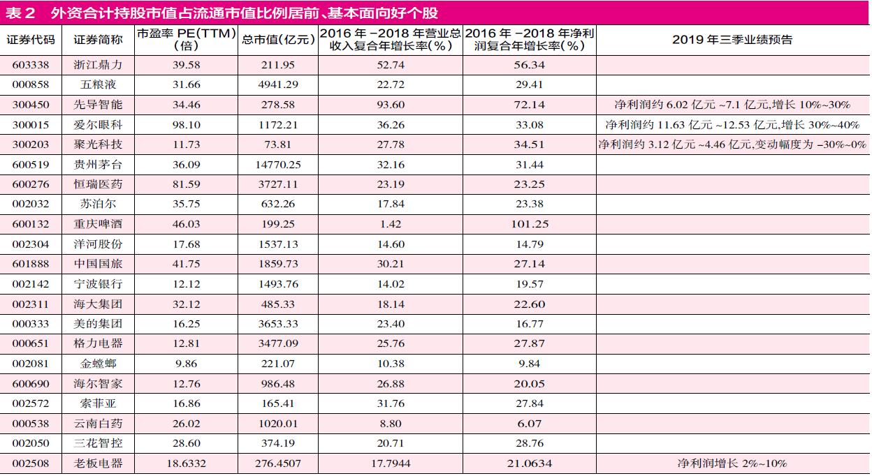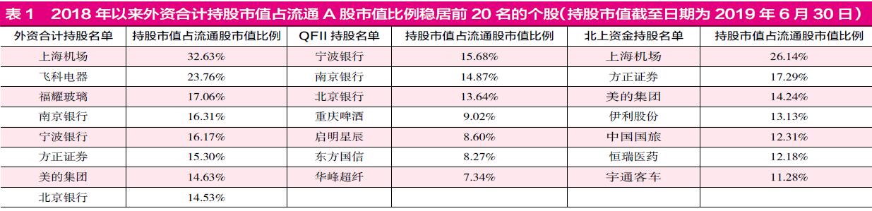就外资重仓个股而言,《红周刊》记者分别梳理了2017年年报~2019年中报4个报告期内“外资合计持股市值占流通A股流通市值比例”居前的20只个股名单。记者发现,在这4个报告期中,位居第20名的个股外资持有市值占流通A股市值比例呈现稳定抬升的态势,这从侧面反映出外资对优质龙头的持续看好。在这4份个股名单中,上海机场、飞科电器、宁波银行、南京银行、北京银行、福耀玻璃、方正证券、美的集团8家上市公司持续上榜。