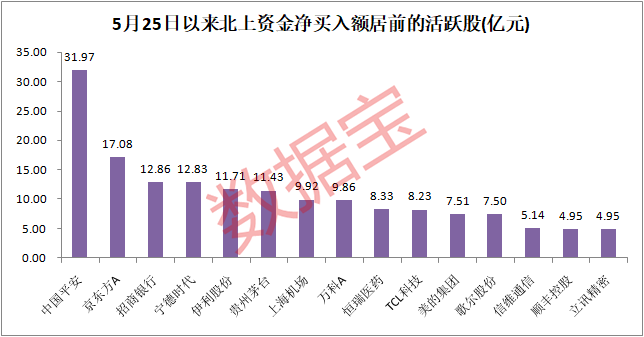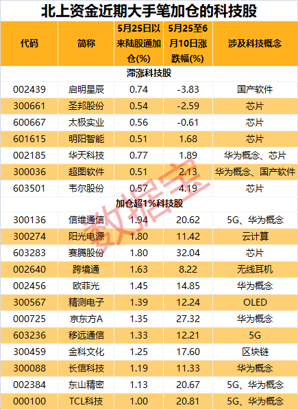 事实上,在科技股强势崛起的背景下,北上资金的投资重心不免也会往科技股靠拢,比如闻泰科技三安光电用友网络等。但仔细研究发现,5月25日至今,前十大活跃股中并未出现这些科技股的身影。