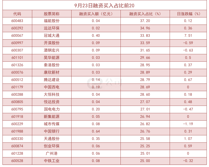 个股方面,沪深两市共有977只个股有融资资金买入。从融资买入额占当日总成交金额比重来看,共有57只股票融资买入额占比超20%,其中福能股份(37.20%)、远达环保(34.96%)、冠城大通(33.83%)排名前三。