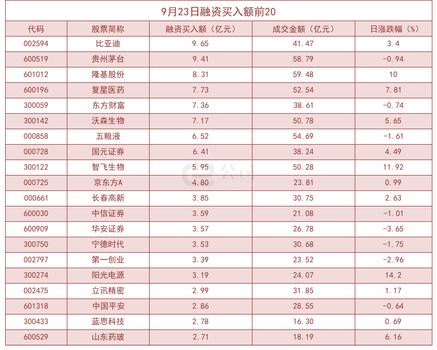 从融资资金买入金额来看,共有98只个股买入金额超亿元,其中比亚迪(9.65亿元)、贵州茅台(9.41亿元)、隆基股份(8.31亿元)居前三位。