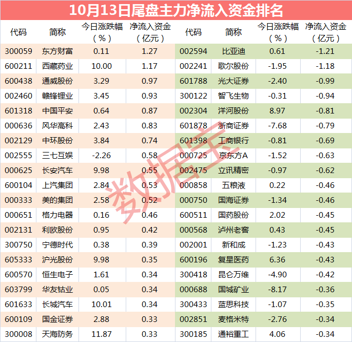 从个股尾盘资金流向数据看,有11股尾盘净流入资金超过5000万元,东方财富、西藏药业、通威股份等个股尾盘资金净流入金额最多,分别高达1.27亿元、1.17亿元、0.97亿元;比亚迪、歌尔股份、光大证券等个股尾盘资金净流出金额最多。