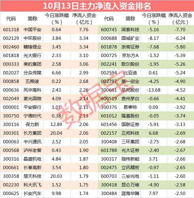 沪指10月13日上涨0.04%,主力资金全天净流出210.54亿元。其中,中小板主力资金净流出33.51亿元,创业板主力资金净流出79.85亿元,沪深300成份股主力资金净流出45.28亿元。