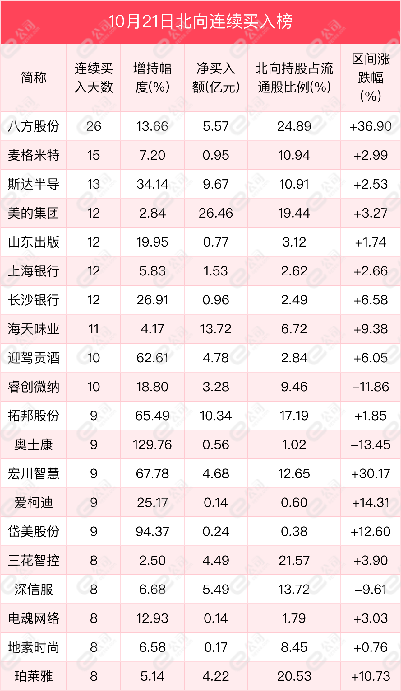 从连续买卖来看,八方股份、麦格米特、斯达半导获北向资金连续净买入天数居前,分别为26天、15天、13天,期间净买入额分别为5.57亿元、0.95亿元、9.67亿元,期间增持幅度分别为13.66%、7.2%、34.14%。
