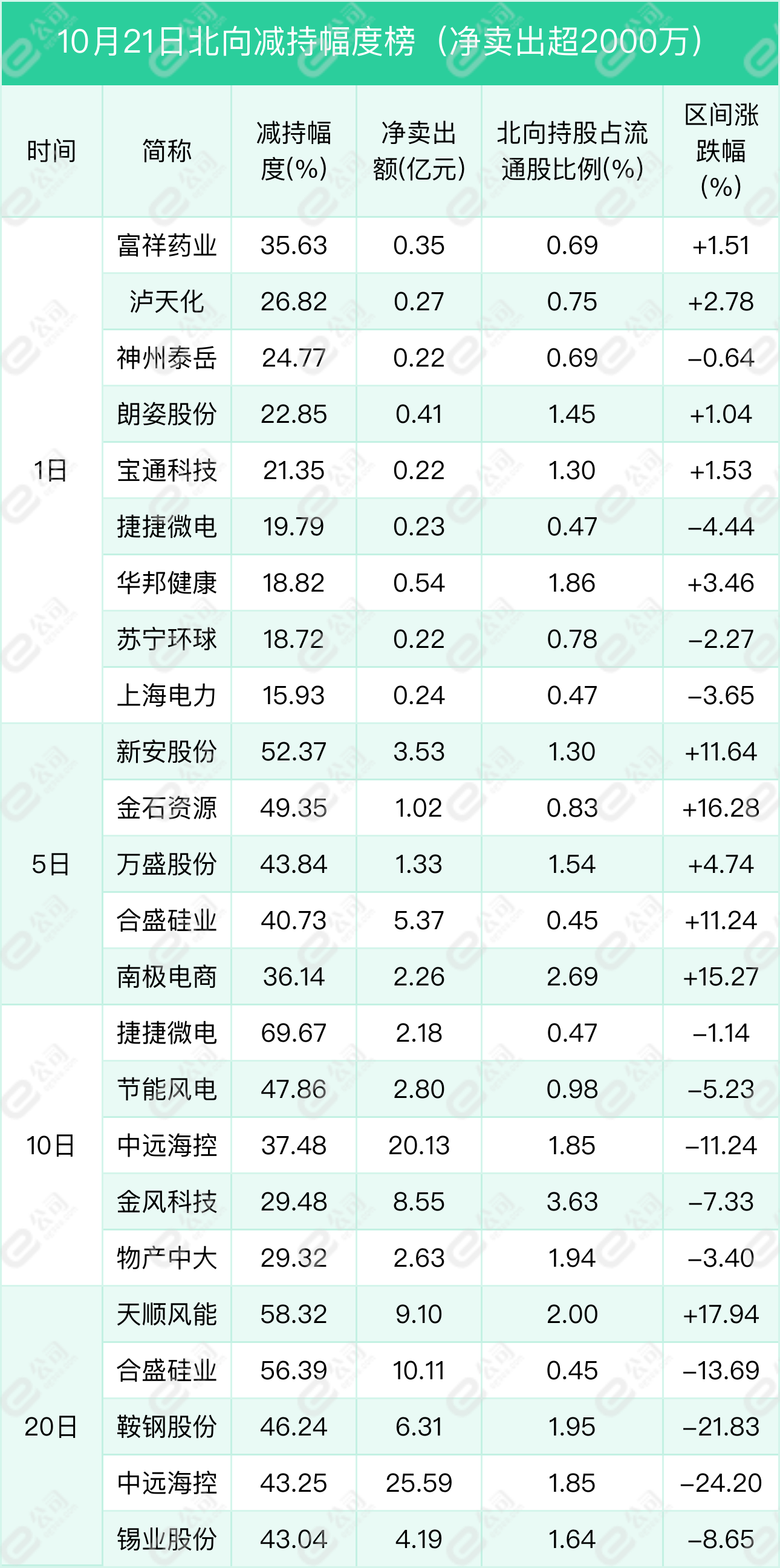 富祥药业、泸天化、神州泰岳遭北向资金减持幅度居前,分别为35.63%、26.82%、24.77%。