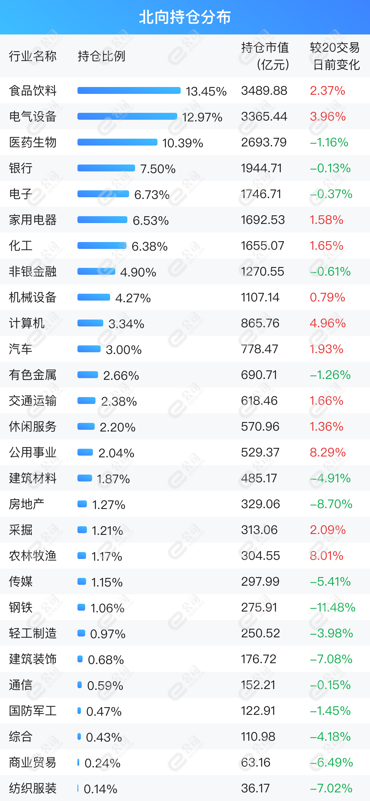 北向资金持仓市值前五行业为食品饮料、电气设备、医药生物、银行、电子,占持仓总市值51.05%。