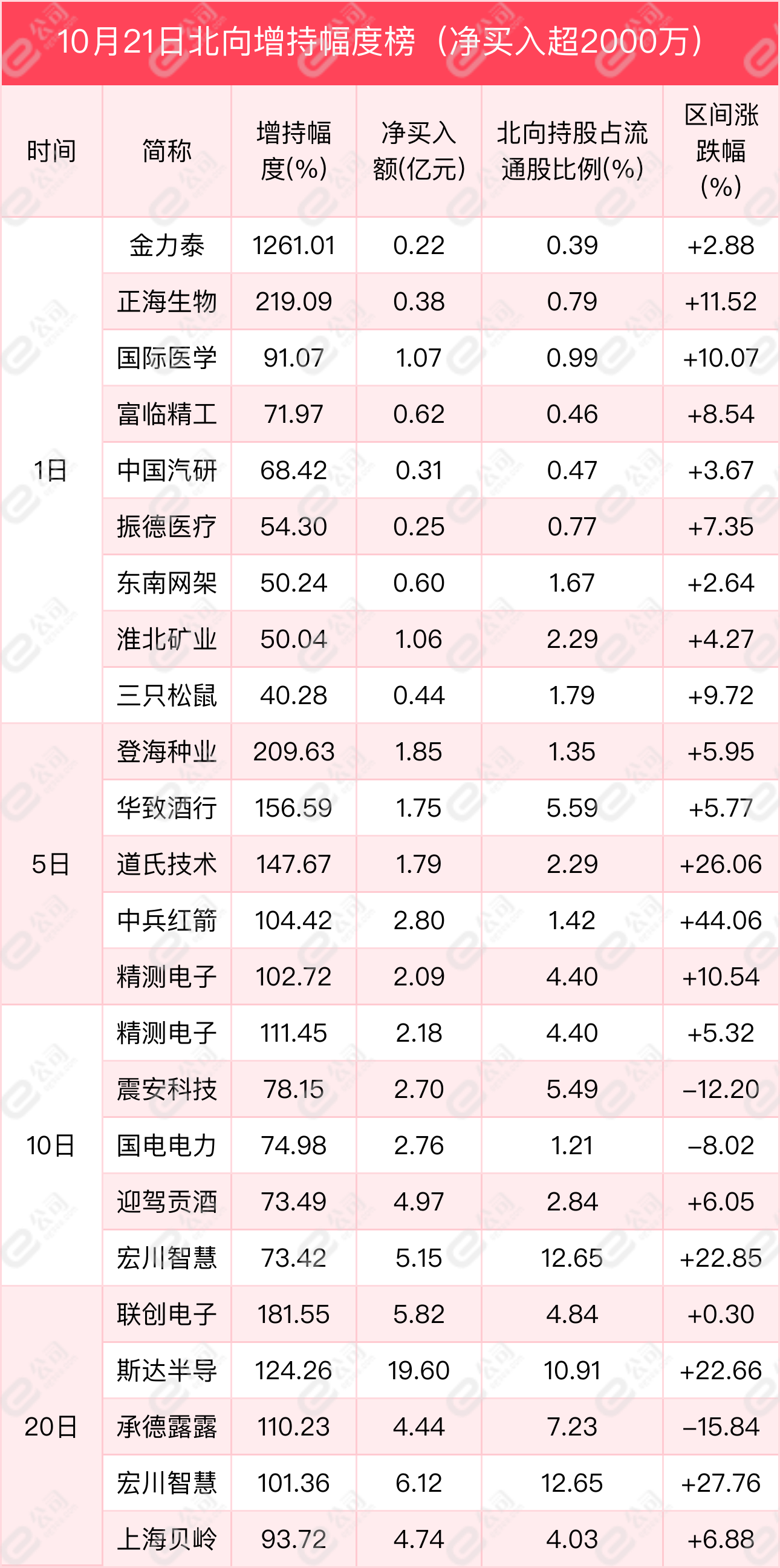 从增减持幅度来看,单日净买卖超2000万元以上的个股中,金力泰、正海生物、国际医学获北向资金增持幅度居前,分别为1261.01%、219.09%、91.07%。