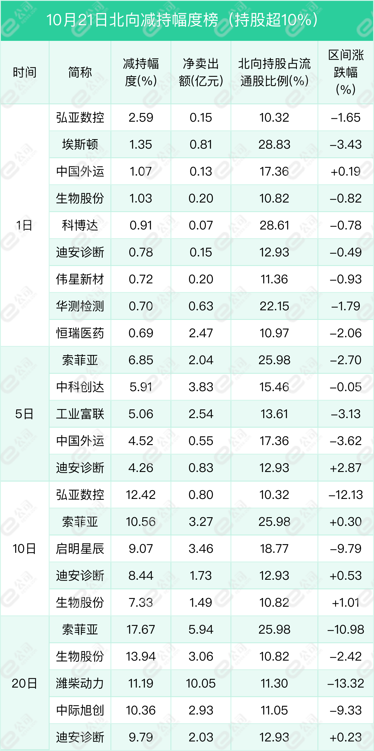 弘亚数控、埃斯顿、中国外运遭北向资金减持幅度居前,分别为2.59%、1.35%、1.07%。