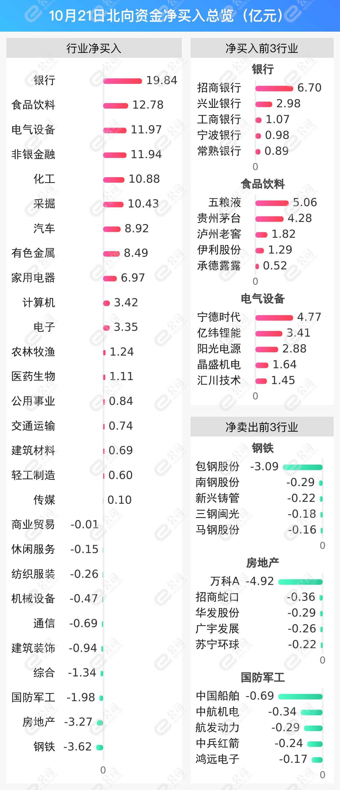 银行、食品饮料、电气设备获北向资金净买入金额居前,分别为19.84亿元、12.78亿元、11.97亿元。